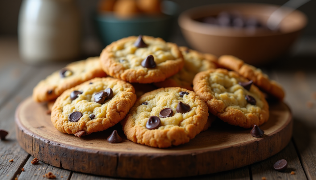 Professional food photography of golden brown chickpea flour cookies with melting dark chocolate chips, placed on a rustic wooden board, soft natural lighting, macro shot, textured surface, minimalist kitchen background.